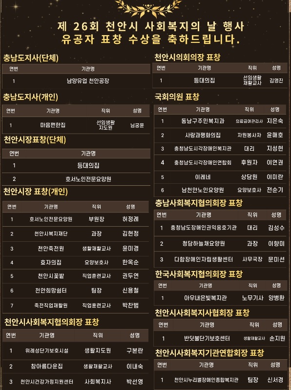 제 26회 천안시사회복지의 날 행사 유공자 표창수상 페이지 정보 작성자작성자 : 천사협 조회조회수 : 2,362회 작성일작성일 : 25-09-23 13:14 본문 수상을 축하 드립니다! 목록 이전글2025년 법인 정기 이사회의(2차) 개최 25.03.11 다음글「제26회 천안시사회복지의 날 행사」사회복지 유공자 추천 협조 요청 25.07.28