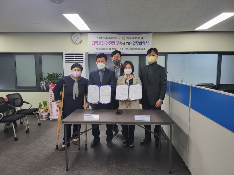 천안시사회복지협의회에서는 2022년 04월14일(목요일) '지역사회 안정망 구축을 위한 업무 협약식'을 천안시사회복지협의회 사무실에서 진행하였습니다.